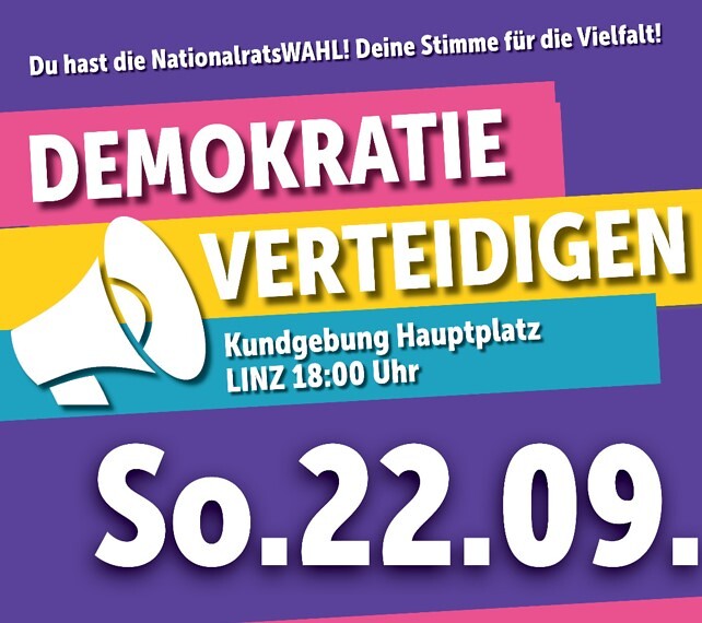 Die Katholische Aktion OÖ unterstützt die Kundgebung „Demokratie verteidigen“ am Sonntag, 22. September um 18:00 Uhr am Linzer Hauptplatz und ruft zur zahlreichen Teilnahme auf.