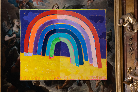 Zu diesem historischen Bilderkanon tritt in der Fastenzeit 2022 ein neues Bild in den Kirchenraum. Es stammt von Béatrice Dreux und zeigt einen Regenbogen mit leuchtend-intensiven Farben vor einem violetten und gelben Hintergrund. Die farbstarke Malerei und die archaische Formensprache wirken magisch anziehen. Das Bild leuchtet aus sich heraus.