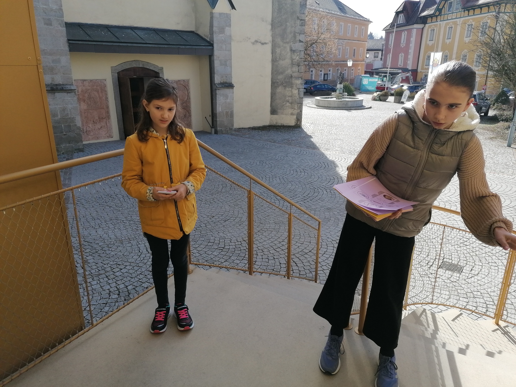 Vier schwere Pakete stehen auch beim Eingang die die Kinder nacheinander nach vor bringen dürfen. Auf jedem Paket steht etwas: