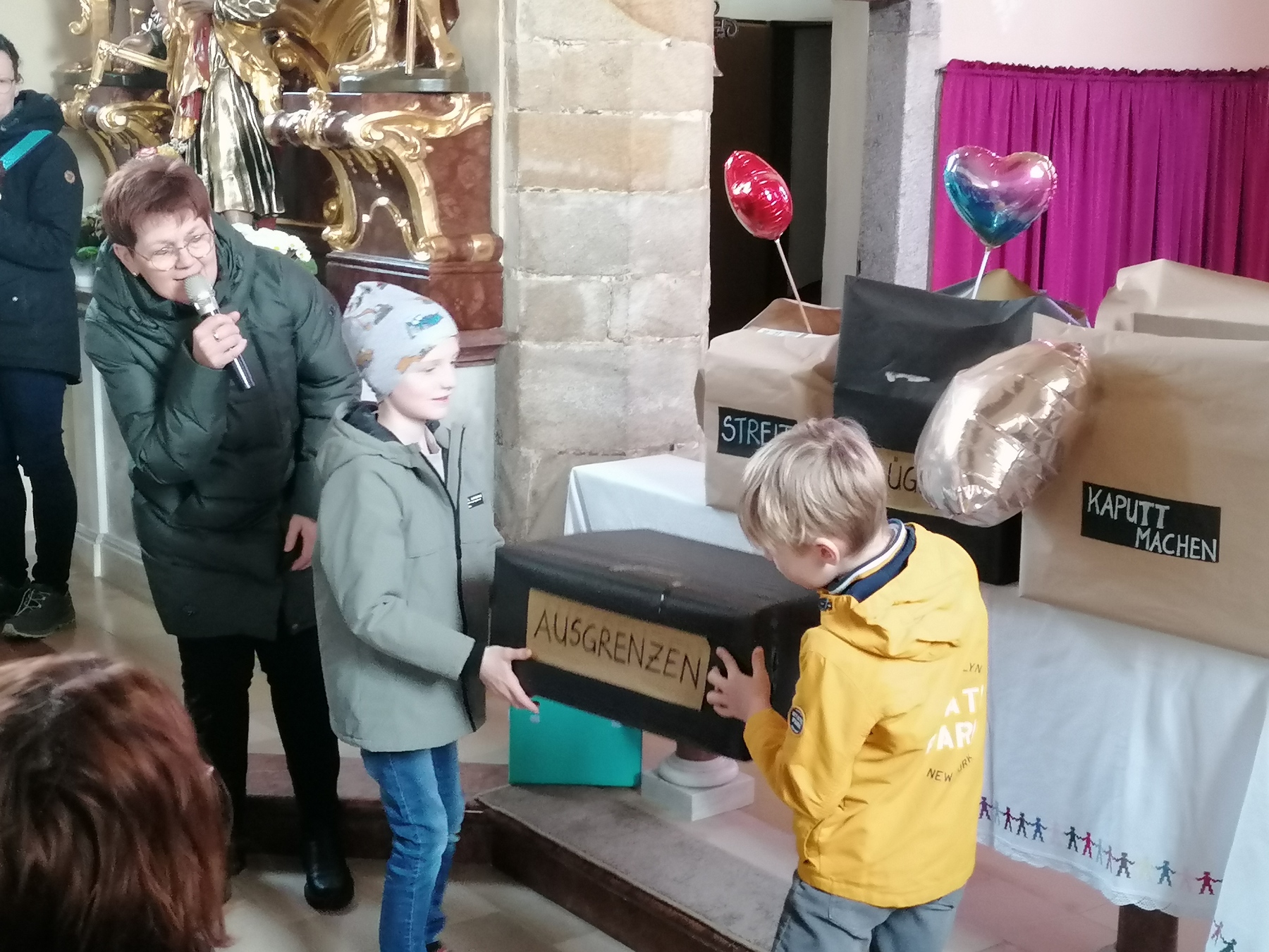 Als Zeichen der Leichtigkeit wird aus jedem Paket ein Herzluftballon ausgepackt und das Lied „Wenn es leichter wir im Herzen danke Gott“ gesungen.