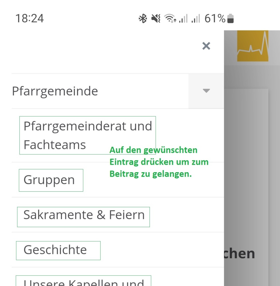 Es gibt auf der Homepage aber auch sehr viele Informationen (Pfarrgemeinderat, Fachteams, Gruppen, Sakrament und Feiern, Geschichte, Kapellen, etc...) die am Hauptbildschirm nicht Platz hätten. Dazu wurde eine Struktur mit Menüs und Untermenüs aufgebaut, die man wie folgt erreicht: