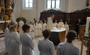 Eine gute Mischung aus Kreativität, Flexibilität und Sorgfalt ermöglichte es, dass am 18. Oktober 10 Kinder aus der Froschbergschule und 20 Kinder aus der Edmund-Aigner-Schule trotz der besonderen Zeit und der vorhandenen Umstände ihre Erstkommunion feiern konnten.